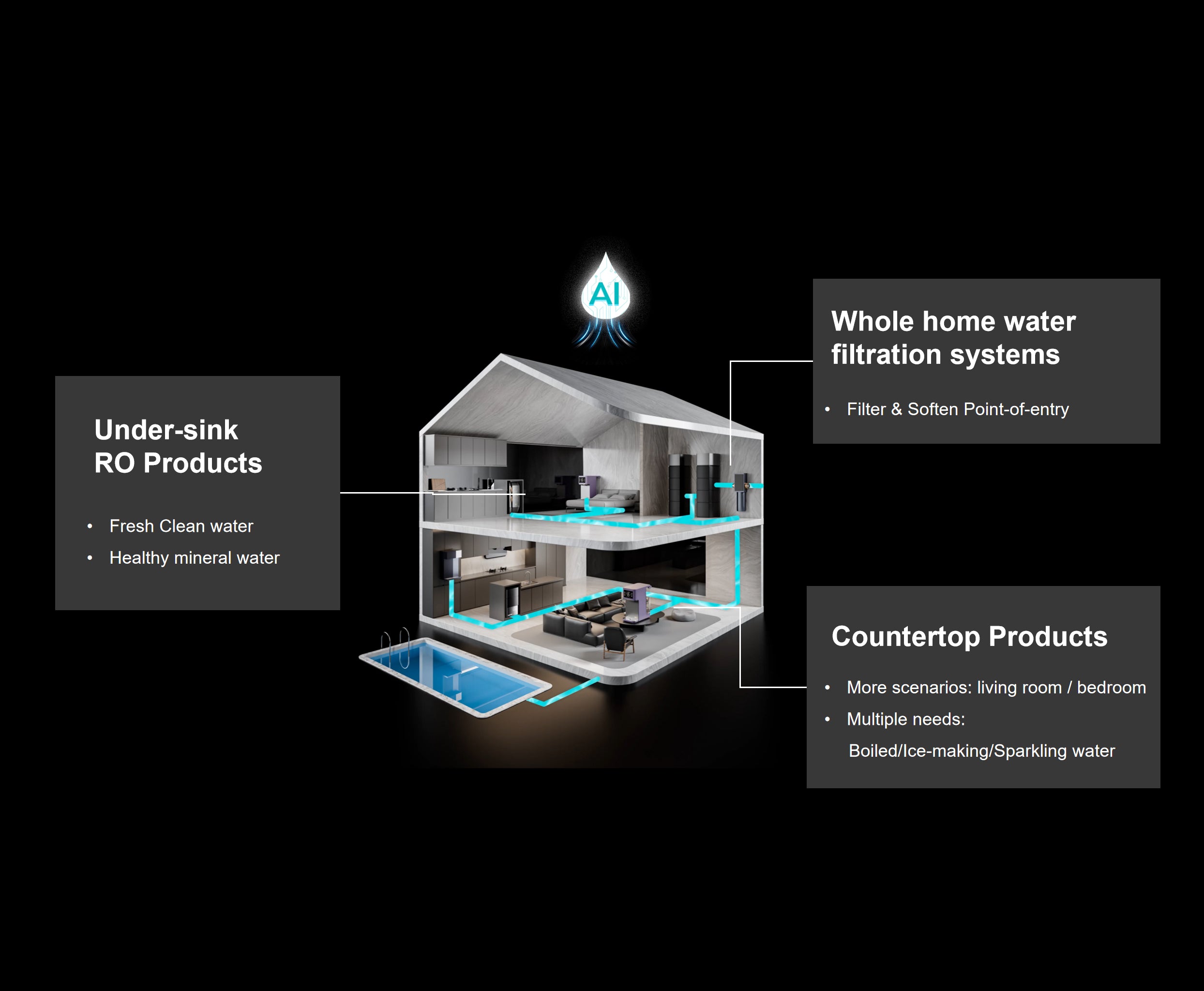 • Point-of-entry filtration products, central water softeners and purifiers, point-of-use products