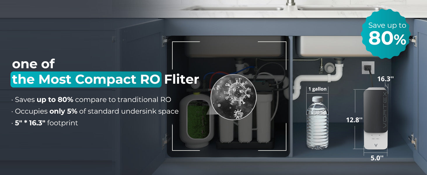 - 【𝐓𝐚𝐧𝐤𝐥𝐞𝐬𝐬 RO System Design】Tankless reverse osmosis system under sink size: 𝟏𝟔.𝟑"𝐱 𝟓.𝟎𝟒"𝐱 𝟏𝟐.𝟕𝟔". Compared with tank water filter system, saving about 𝟔𝟕% under sink space to be compatible with most kitchen under sink environments. Note: Viomi under sink water filter requires an electrical outlet and drilling holes during installation. Please measure your cabinet dimensions to ensure the space is larger than the product size.