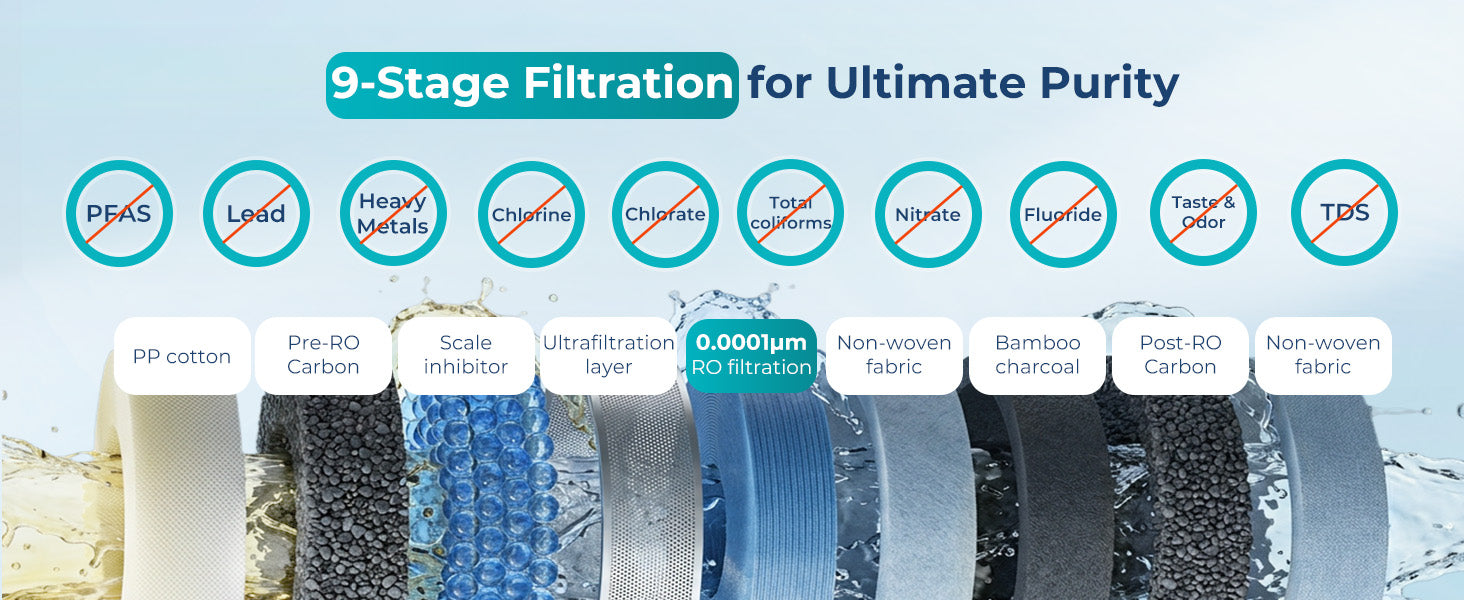 A: The advanced 9-stage system uses a 0.0001μm reverse osmosis membrane. It precisely removes scale, heavy metals, chlorine, and unpleasant odors, significantly improving the taste and quality of your drinking and cooking water.